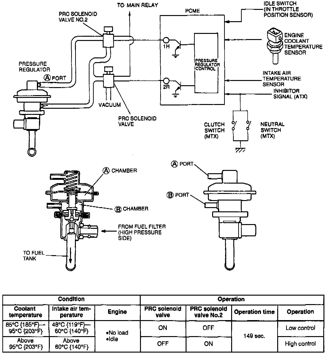 The vacuum to the pressure regulator (A port) is cut (PRC solenoid valve OFF, PRC solenoid valve No. 2 ON), and the fuel injection pressure is increased to 343 kPa (50 psi).