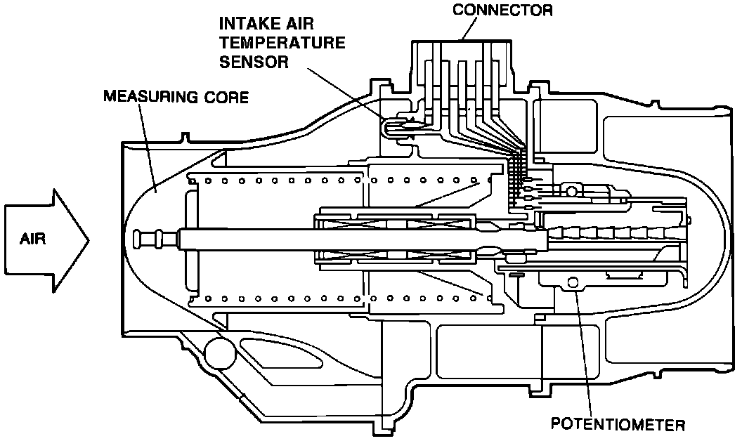 The volume airflow sensor is a sliding core type. It contains a measuring core in a large venturi, supported by a light spring. A sliding potentiometer is attached to the core which provides a variable resistance that coincides with core movement. The volume airflow sensor also contains an integral intake air temperature sensor which is not serviceable separately.