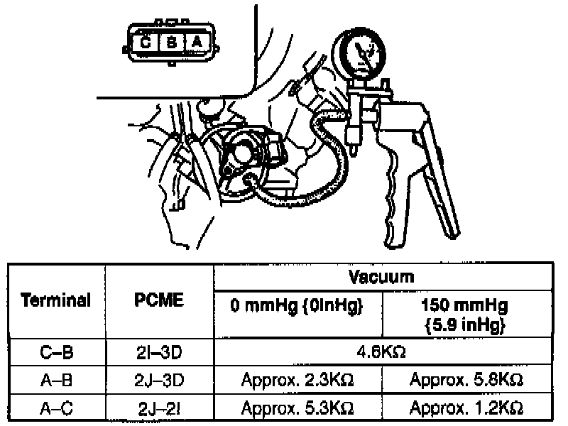 6. If not correct at terminal C, measure sensor resistance, then wiring harness and PCME terminal 2F.