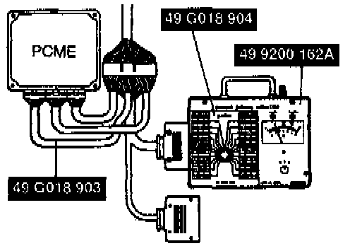1. Disconnect powertrain control module engine (PCME) connector and connect special service tools (SST)s (Engine Signal Monitor and Adapter) to PCME as shown.