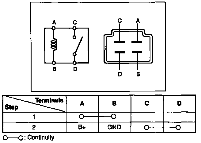 3. Apply voltage battery to terminal D and ground terminal A. Continuity should now exist between terminals C and E. If not, replace relay.