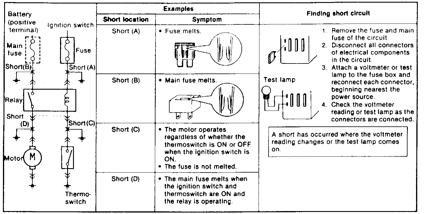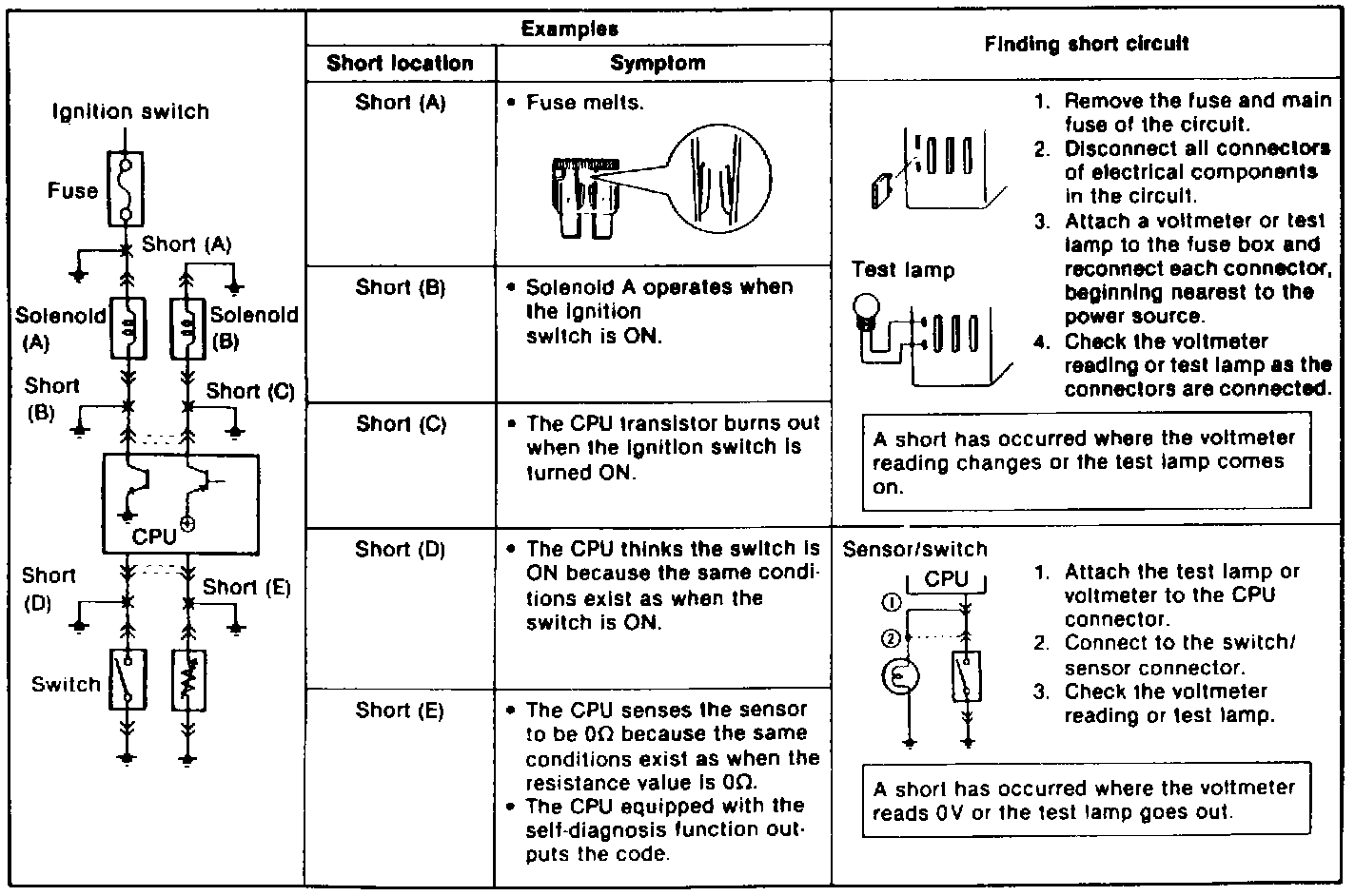 Shorts occur between the power (positive) and ground(negative) sides of a circuit. Therefore, finding a short circuit requires determining how the circuit is routed.Finding Short Circuits-Circuits Not Connected To Control Unit: