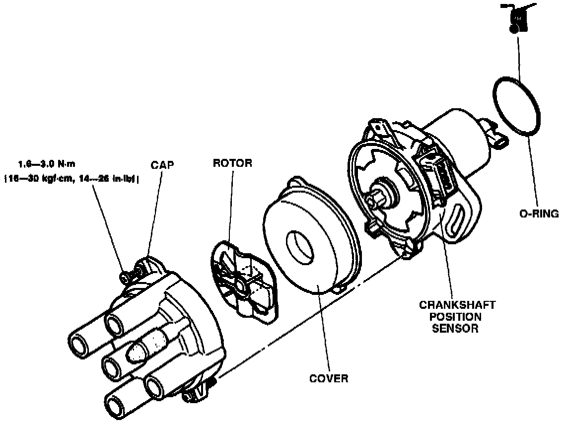 Distributor includes a built-in crankshaft position sensor that sends engine speed and #1 cylinder TDC signals to the PCME. To calculate ignition timing, the PCME uses this input together with several others related to vehicle operating conditions. Except for the initial setting, ignition timing is under PCME control.