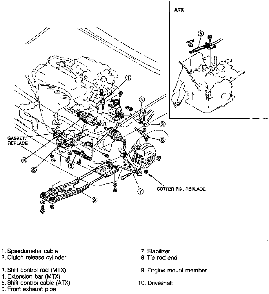 b. Suspend engine with a chain block or equivalent, then remove No. 1 and No. 2 engine mount retaining nuts from engine mount crossmember.