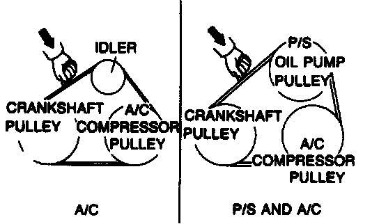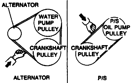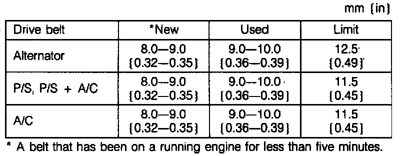 3. Check the drive belt deflection when the engine is cold, or at least 30 minutes after the engine has stopped. Apply moderate pressure 98 N {10 kgf, 22 lbf} midway between the specified pulleys.