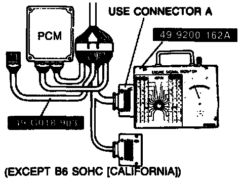 2. Connect the Engine Signal Monitor (49 9200 162A) and Adapter Harness (49 G018 903) to the powertrain control module (transaxle) as shown.