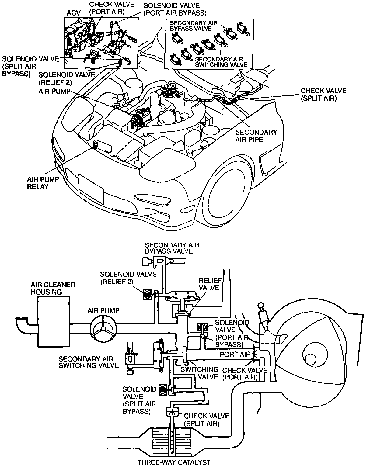 This system consist of an air control valve (ACV), three way solenoid valves, air pump relay and powertrain control module engine.