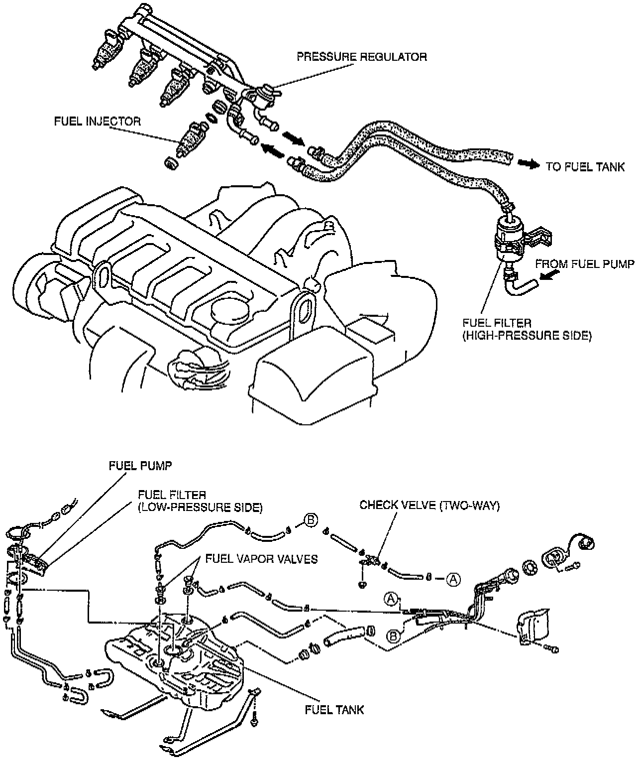 This system supplies the fuel to the fuel injectors at a constant pressure. Fuel is metered and injected into the [1][2]intake manifold according to injection control signals from the ECM. The system consists of the fuel tank, fuel pump, fuel filters, pressure regulator, pressure regulator control solenoid valve, fuel injectors, and fuel pump relay.