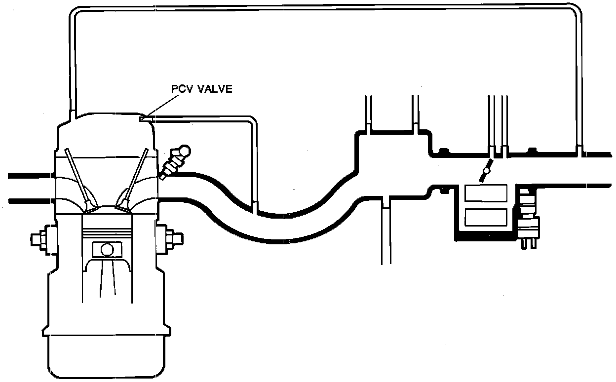 The PCV valve is operated by the [1][2]intake manifold vacuum. When the engine is running at idle, the PCV valve is slightly open and a small amount of blowby gas is drawn into the intake manifold to be burned. As the engine speed rises, the PCV valve is opened further, allowing a larger amount of blowby gas to be drawn into the intake manifold.
