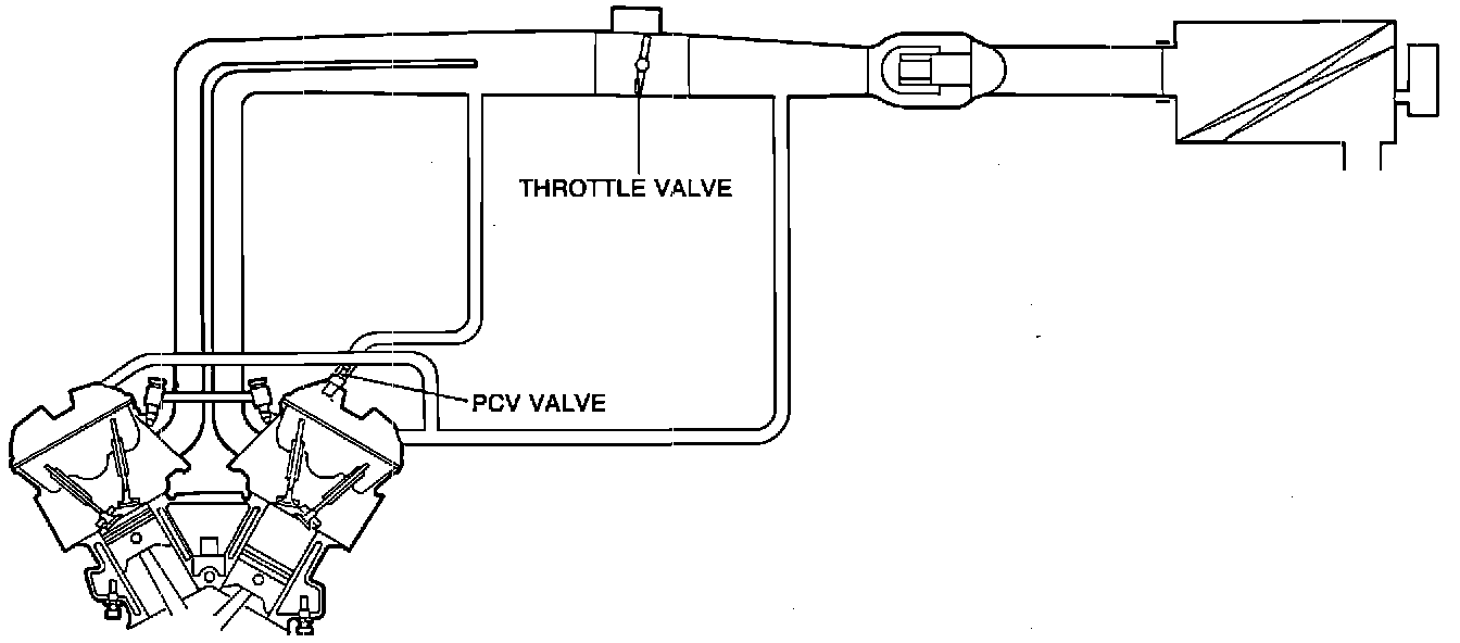 The PCV valve is operated by the intake manifold vacuum. When the engine is running at idle, the PCV valve is slightly open and a small amount of blowby gas is drawn into the dynamic chamber to be burned. As the engine speed rises, the PCV valve is opened further, allowing a larger amount of blowby gas to be drawn into the dynamic chamber.