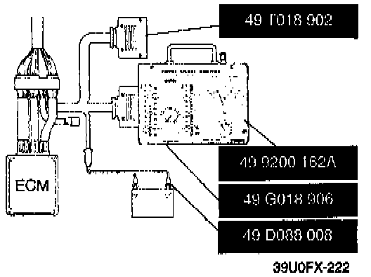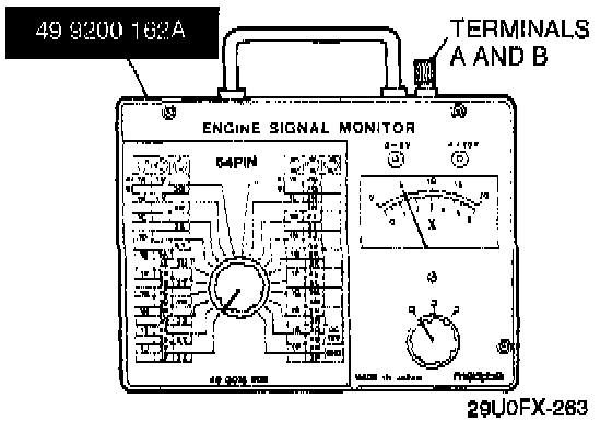 3. Connect the special service tool (SST) to the ECM as shown. Use connector "A" of the adapter to measure voltage at terminals "1A" through "1V" and "3A" through "3Z", and use connector "B" to measure voltage at terminals "2A" through "2P".