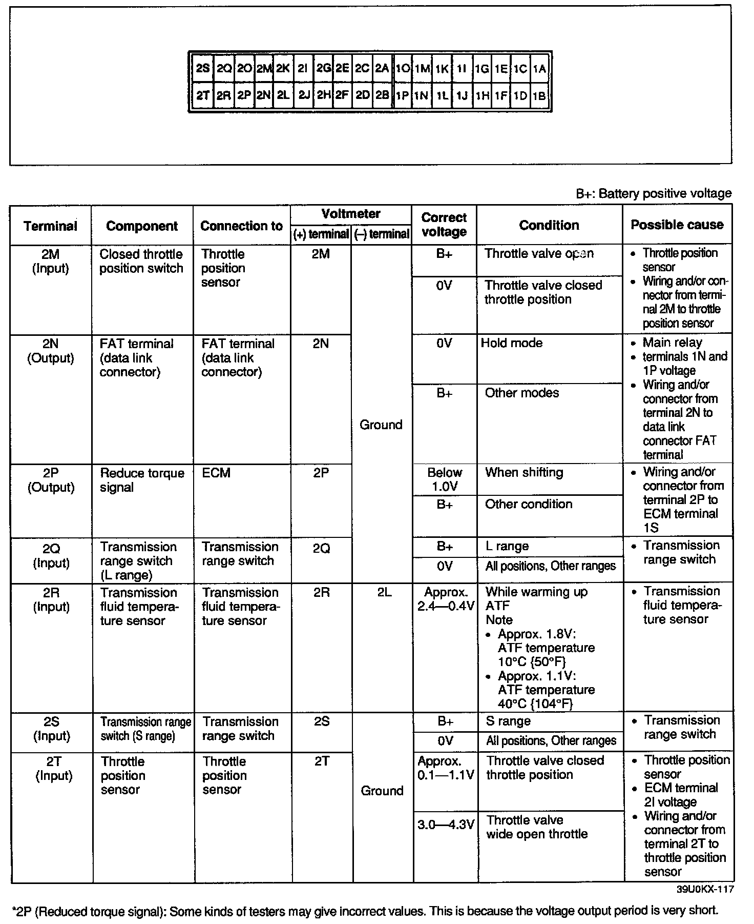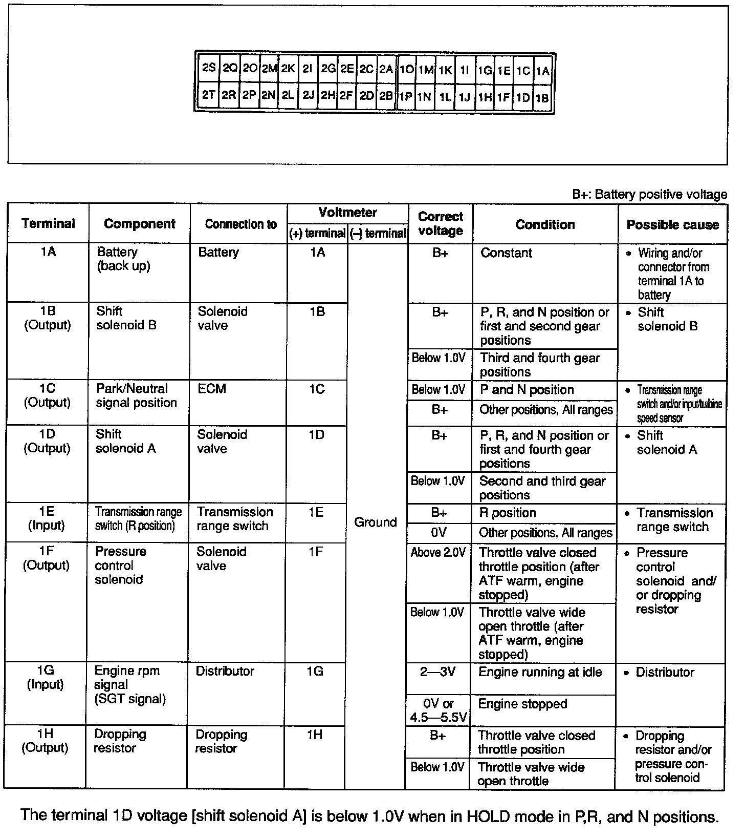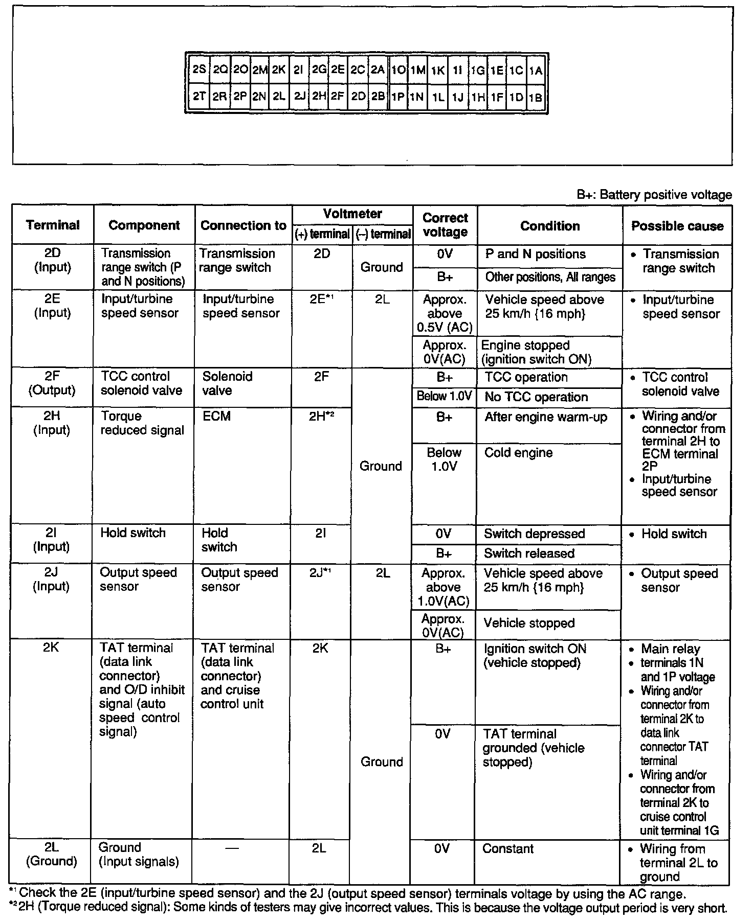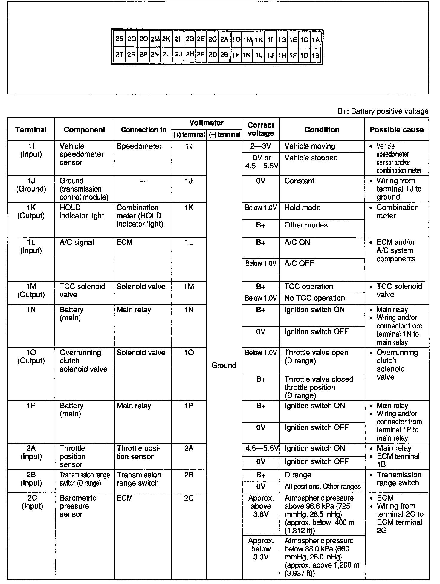 7. If any transmission control module terminal voltage is incorrect, check the related input or output devices and wiring. If no problem is found, replace the transmission control module.