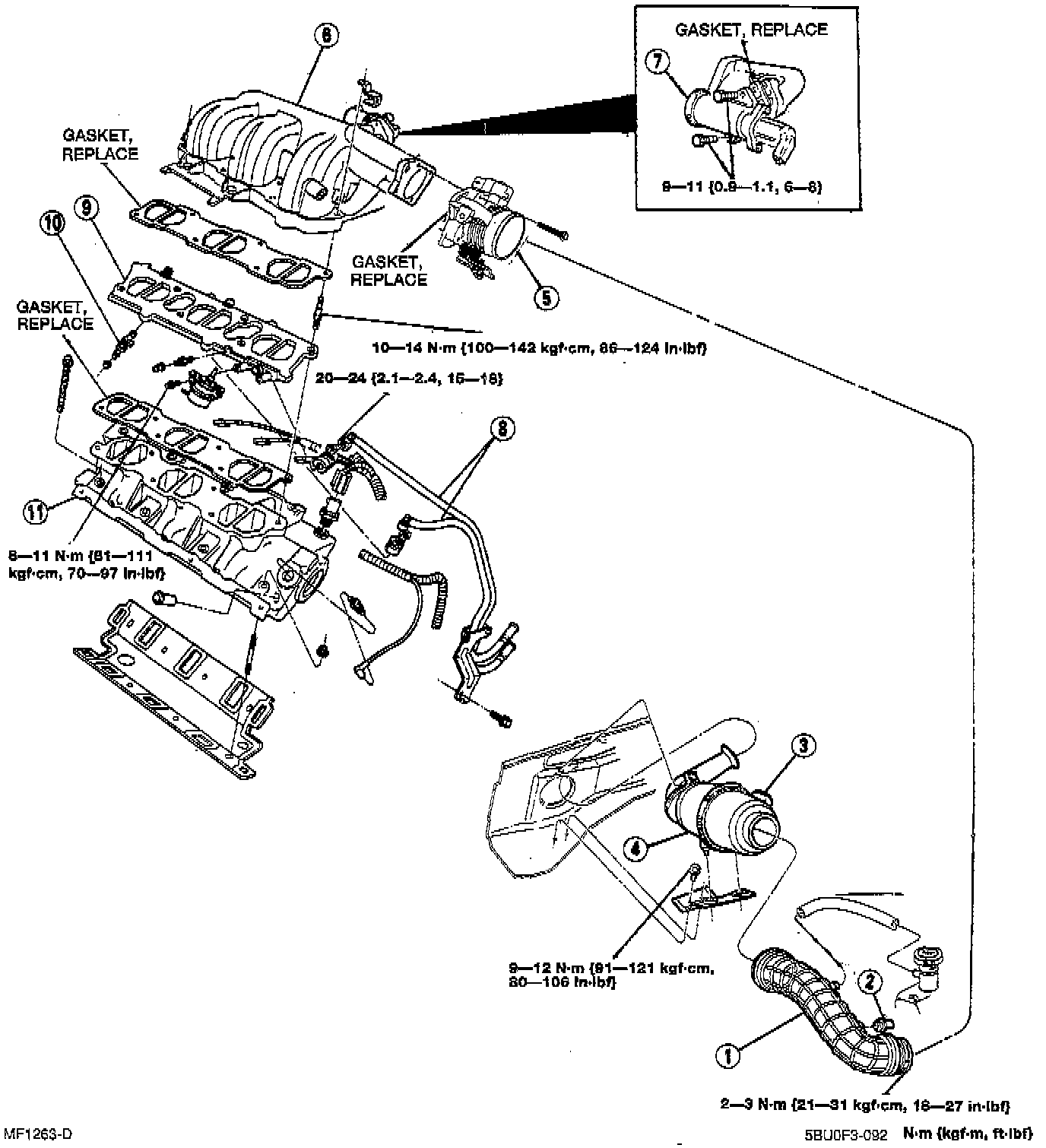 7. Install the upper intake manifold and tighten the nuts.