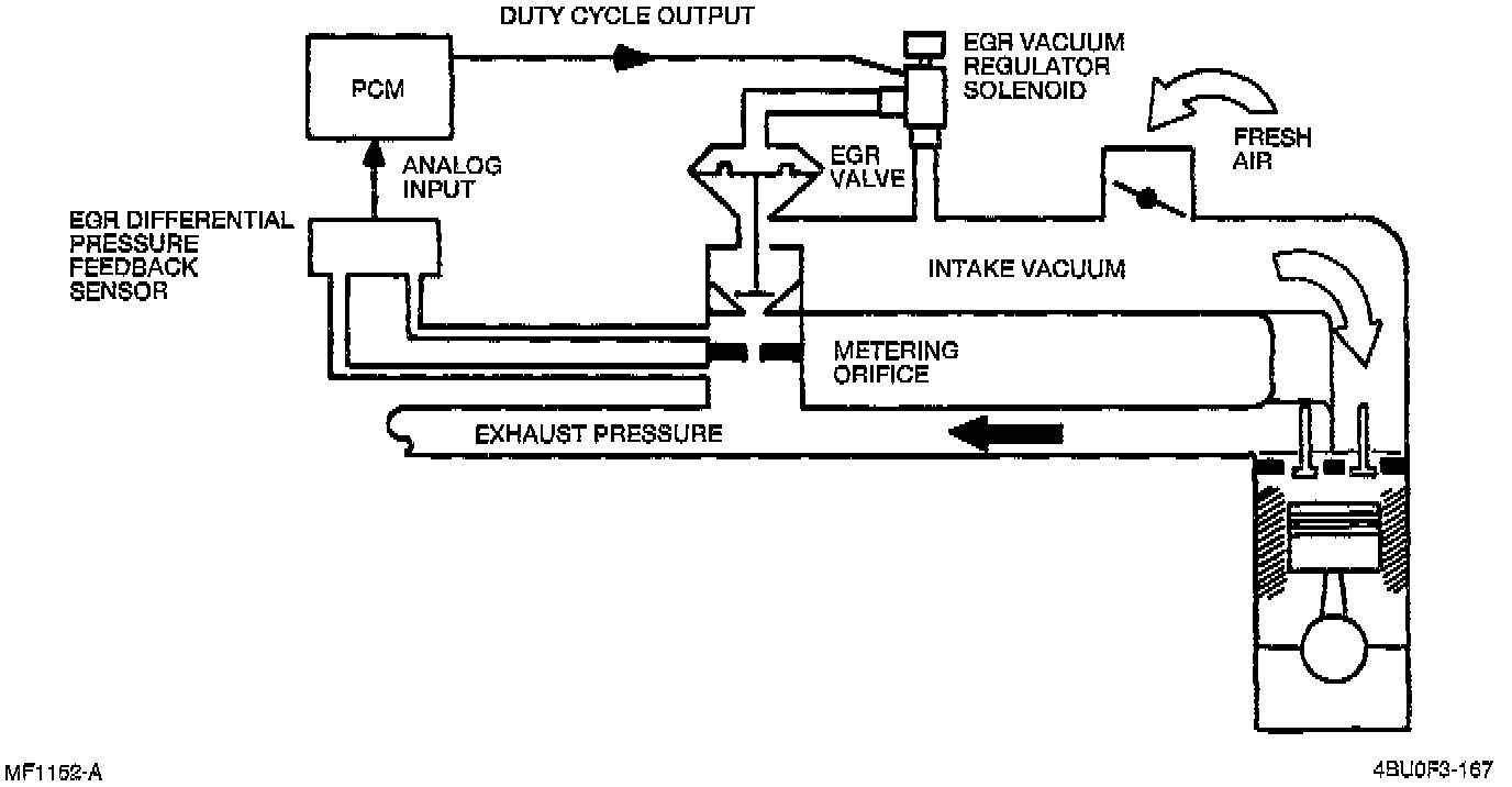 This system recirculates a small amount of exhaust gas into the intake manifold to reduce the combustion temperature and reduce the NOx emissions. This system consists of the EGR valve, EGR vacuum regulator solenoid, differential pressure feedback EGR sensor, powertrain control module (PCM) and input devices.