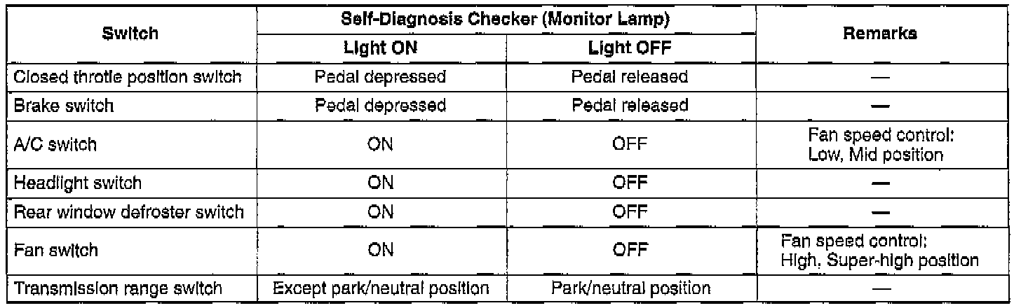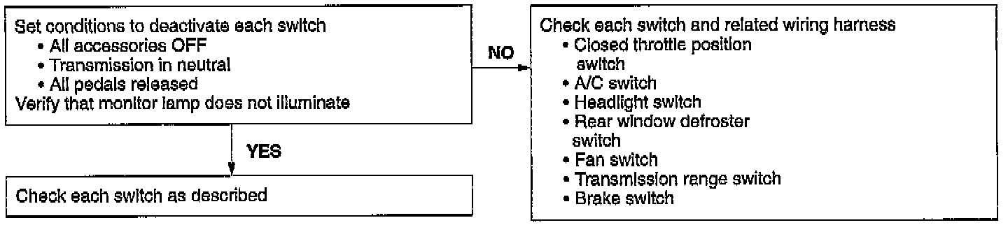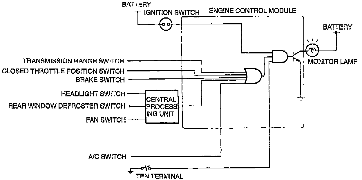 The TEN terminal of the data link connector must be grounded and the ignition switch turned to ON (engine off). If any switch remains activated, the monitor lamp will be illuminated.