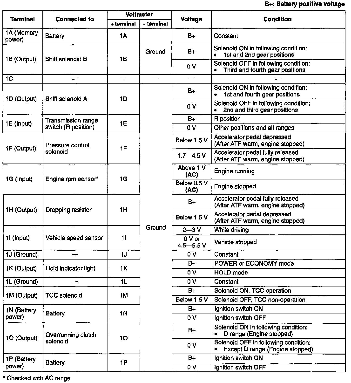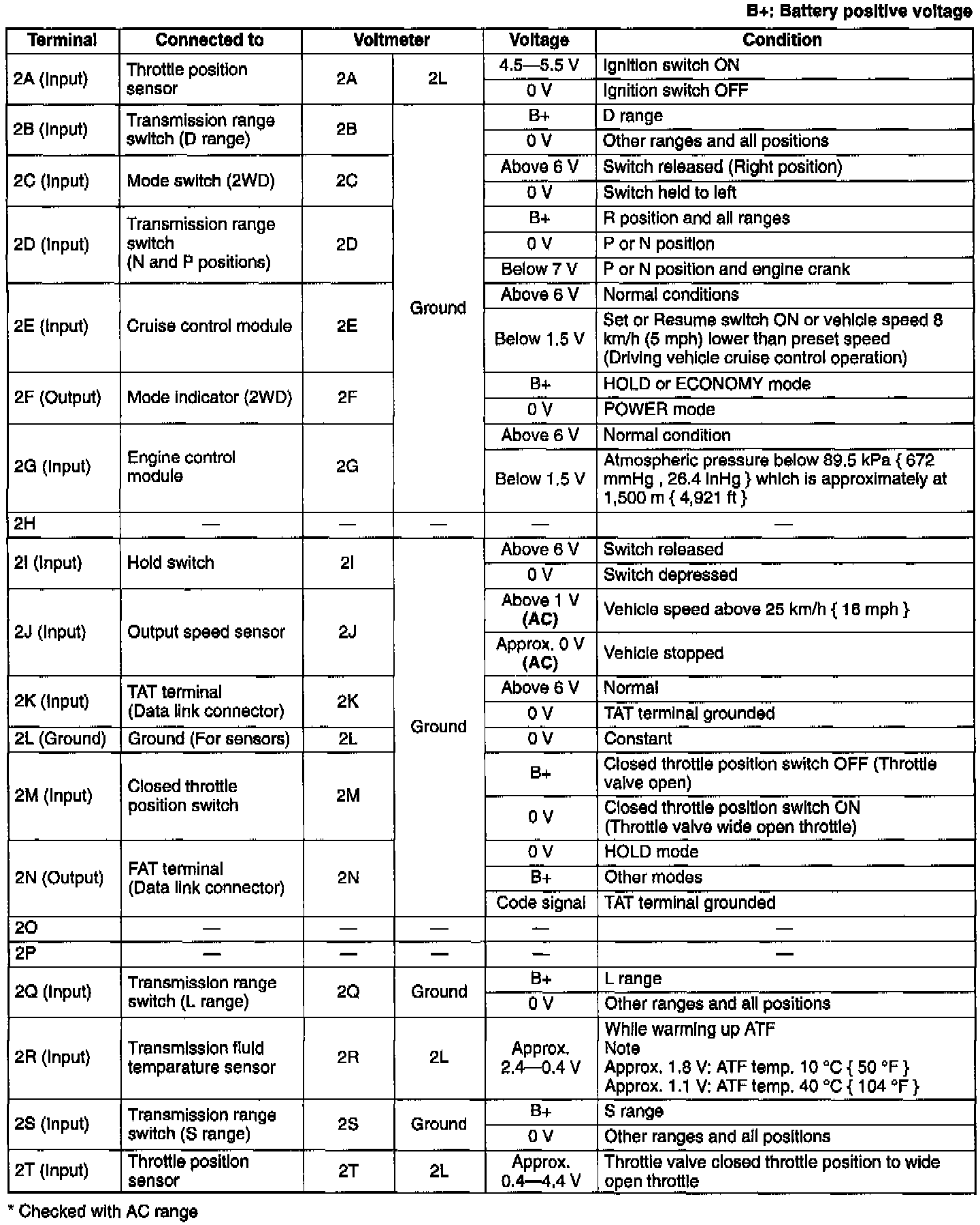 1. Turn the ignition switch ON, and check the Transmission Control Module terminal voltage, referring to the Terminal Voltage Charts.