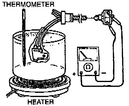 5. Place the transmission fluid temperature sensor in water with a thermometer as shown and heat the water gradually.
