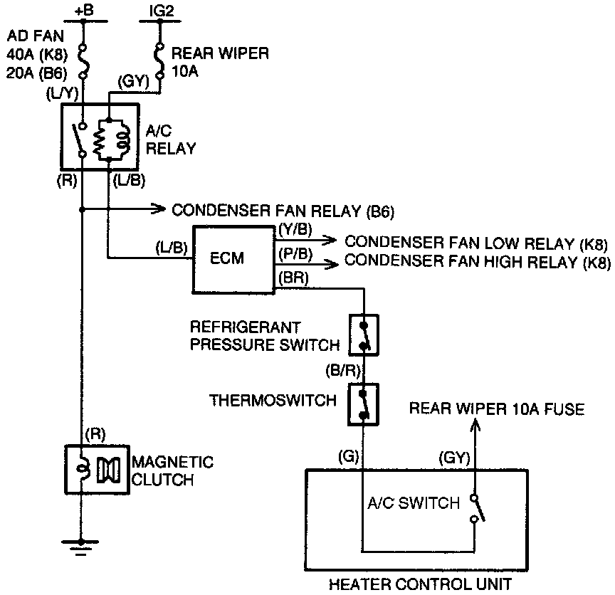 If readings are not as shown then inspect refrigerant pressure switch, thermoswitch, and wiring between ECM terminal 1Q (BR wire) and heater control unit terminal (G wire) from Air Conditioning Switch.