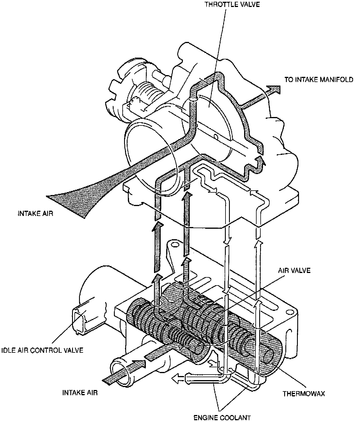 This system consists of the air valve that functions only when the engine is cold, the idle air control valve that works throughout the entire engine speed range, and the control system.