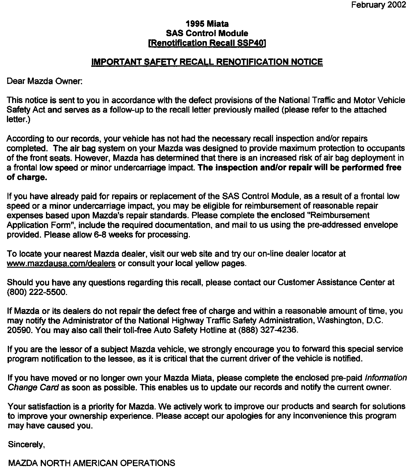 Attachment III - Owner Letter - February 2002
