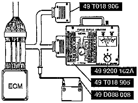 6. Increase the engine speed over 4,000 rpm and measure the voltage at ECM terminals 4E and 4I by using a volt meter.