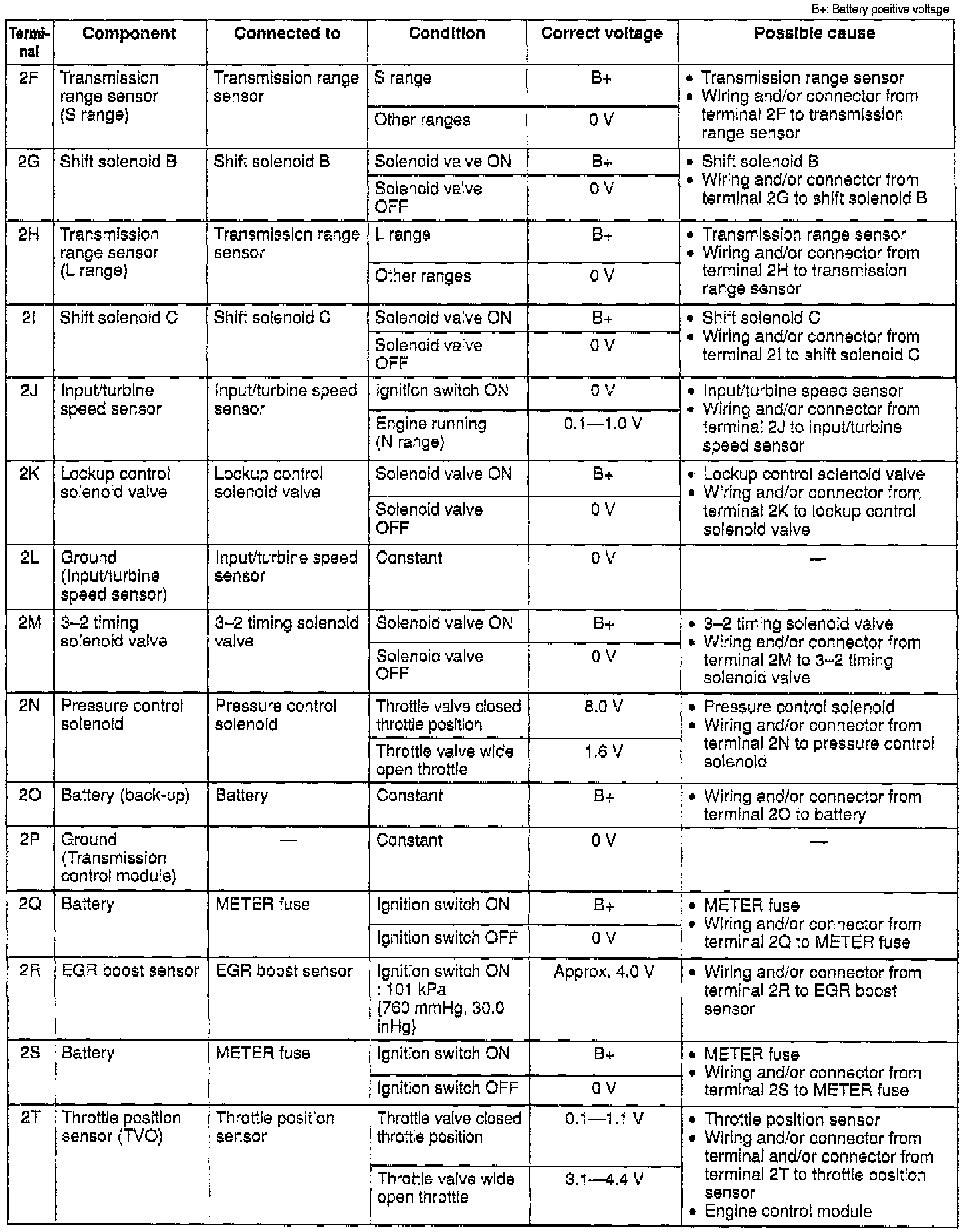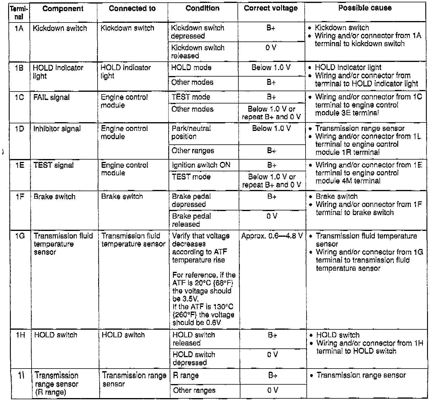7. If any transmission control module terminal voltage is incorrect, check the related input of output devices and wiring. If no problem is found, replace the transmission control module.