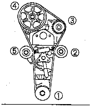 2. Install the timing belt on the pulleys in the order shown below.
