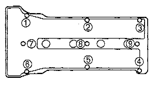 6. Tighten the cylinder head cover bolts in five or six steps in the order shown.
