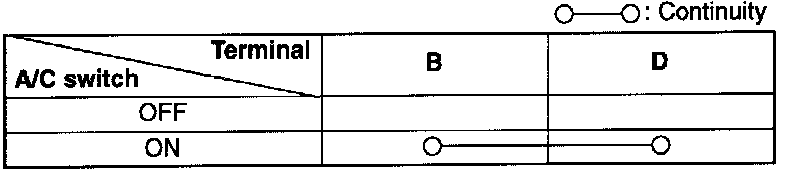 Check for continuity between terminals B and D while pressing the A/C switch.