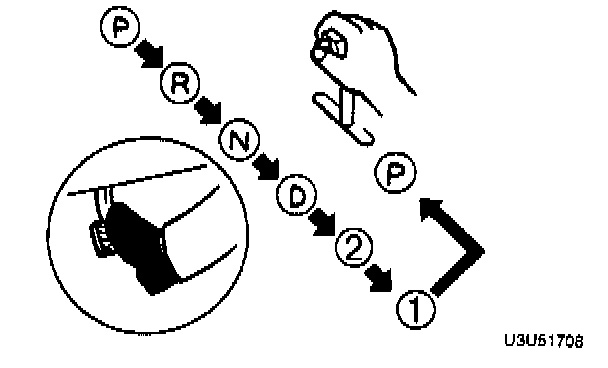 5. While depressing the brake pedal, shift the selector lever to each range (P-1), pausing momentarily in each range.