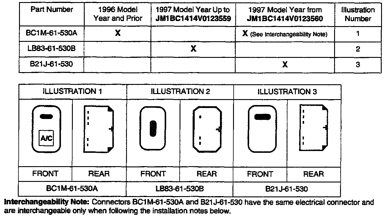 Repeated changes have been made to the A/C switch utilized during system installation. Refer to the chart shown and the installation notes to identify the required switch and correct action.