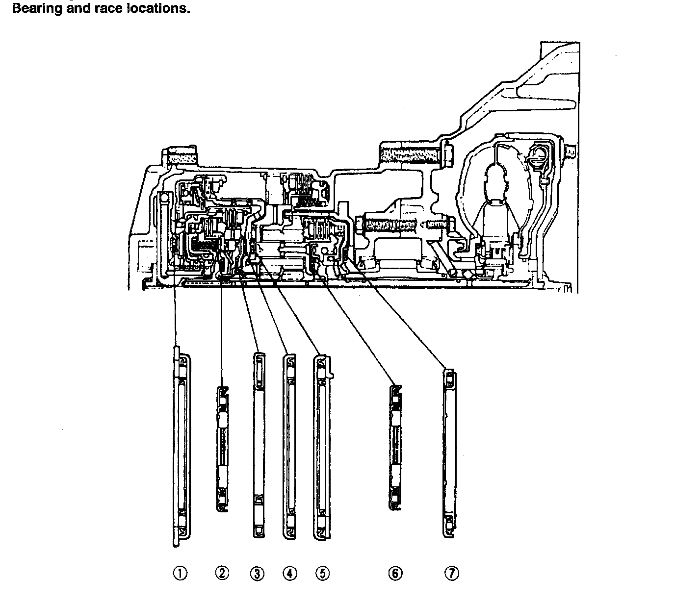 ^ The bearing and race at locations 2, 3, 4, 6, and 7 are one-piece units.