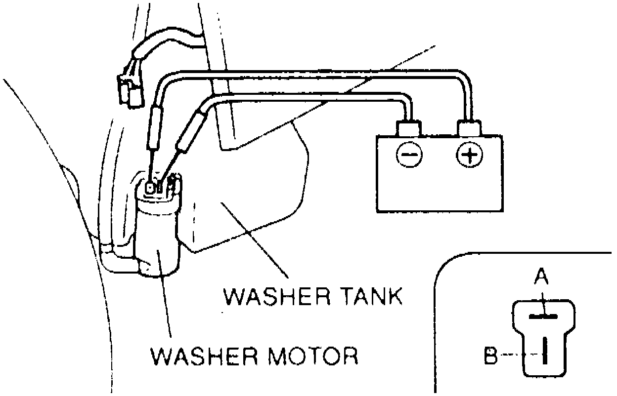1. Remove righthand mud guard, then disconnect washer motor connector.2. Apply B+ voltage to terminal B and ground to terminal A, Fig. 59, and ensure washer motor operates.