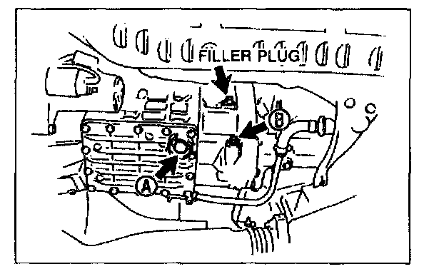 2. Remove plug A (with washer) and B, and drain the oil into a suitable container.