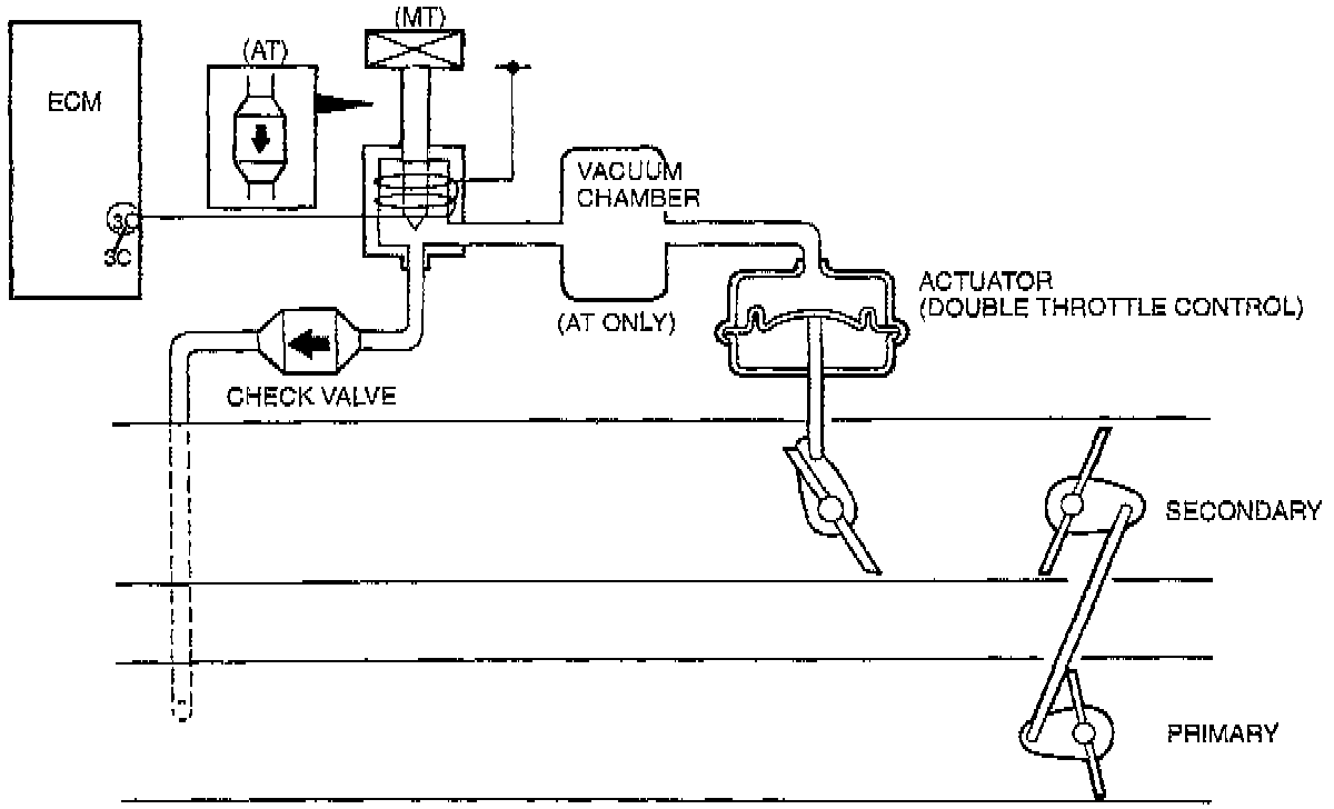 When the engine coolant temperature below 80°C (176°F) the ECM turns the solenoid valve ON, applies vacuum to the Actuator (Double Throttle Control), and closes the Double Throttle Valve.
