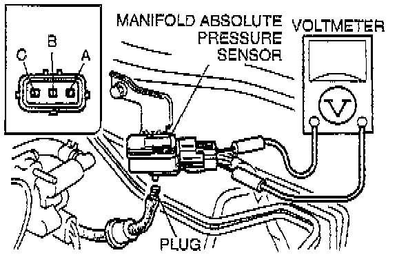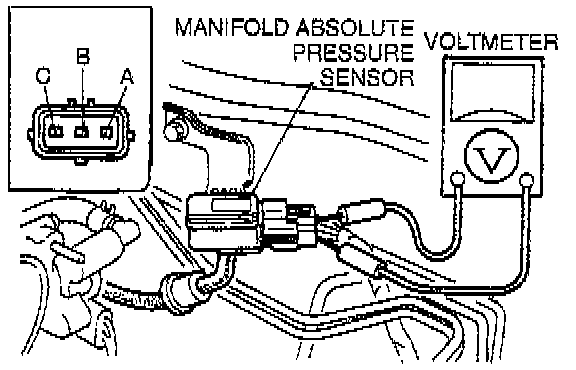 3. Connect a voltmeter between the manifold absolute pressure sensor terminal A and B and verify that the voltage is within specification.