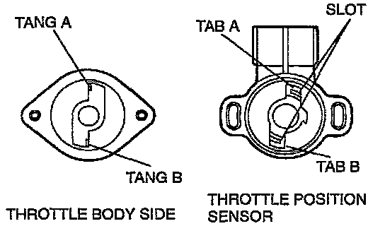- Tangs on the throttle body mate with the tab on the throttle position sensor on the side of the tab without a slot.