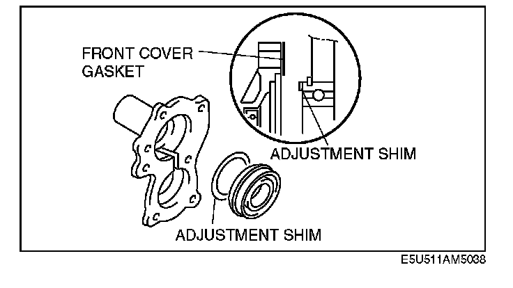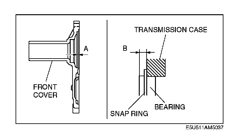 After measuring dimensions A and B shown in the figure, use the adjustment shim(s) of the thickness corresponding to the value of A minus B, so that the bearing end play will be within the specification.