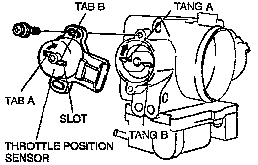 5. Open the throttle valve slightly and catch the tang of the throttle body on the throttle position sensor plastic tabs. Adjust tang A on throttle body with tab A on throttle position sensor. Note tangs on the throttle body mate with the tab on the throttle position sensor on the side of the tab without a slot.
