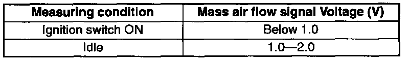 - If not as specified, inspect the harness and connector between the mass air flow sensor and the PCM terminal.
