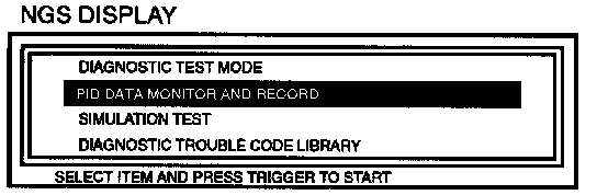 - Connect the Special Service Tools (SST)s New Generation Star (NGS) tester to the data link connector-2 and select the PID/DATA MONITOR AND RECORD function.