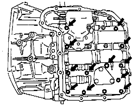 22. Remove the twelve control valve body assembly mounting bolts shown.