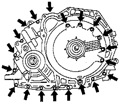 37. Remove the twenty converter housing-to-transaxle case bolts.