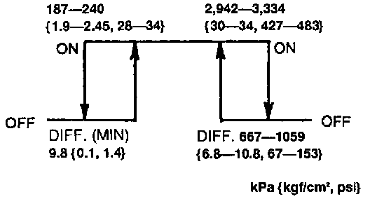 If problems occur in the refrigerant system that cause abnormally high pressure (above 2,942-3,334 kPa {30- 34 kgf/cm2 427-483 psi}) or abnormally low pressure (below 177-230 kPa {1 .8-2.35 kgf/cm2, 26-33 psi}), the refrigerant pressure switch will cut power to the magnetic clutch to protect the mechanical components. If the pressure recovers to within normal operating range, the power will be restored.