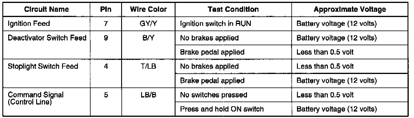 Cruise Control Servo Switch AssemblyTo test cruise control servo switch, perform the following voltage and resistance measurements.