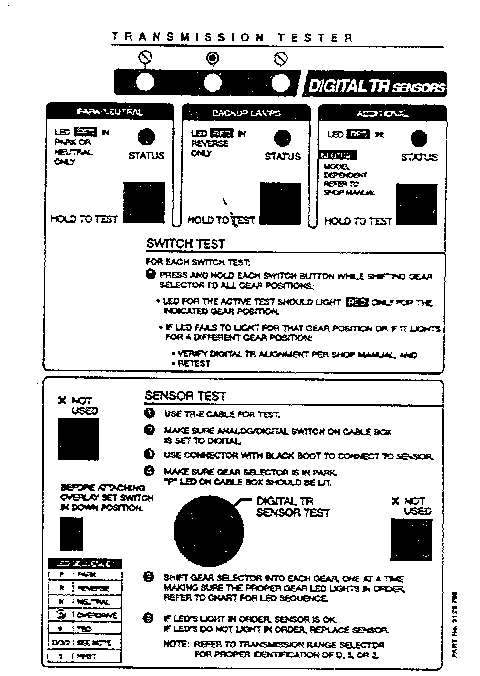 NOTE: The transmission tester allows a technician to operate the electrical portion of the TR sensor.TRANSMISSION RANGE (TR) SENSOR TESTING USING TRANSMISSION TESTER