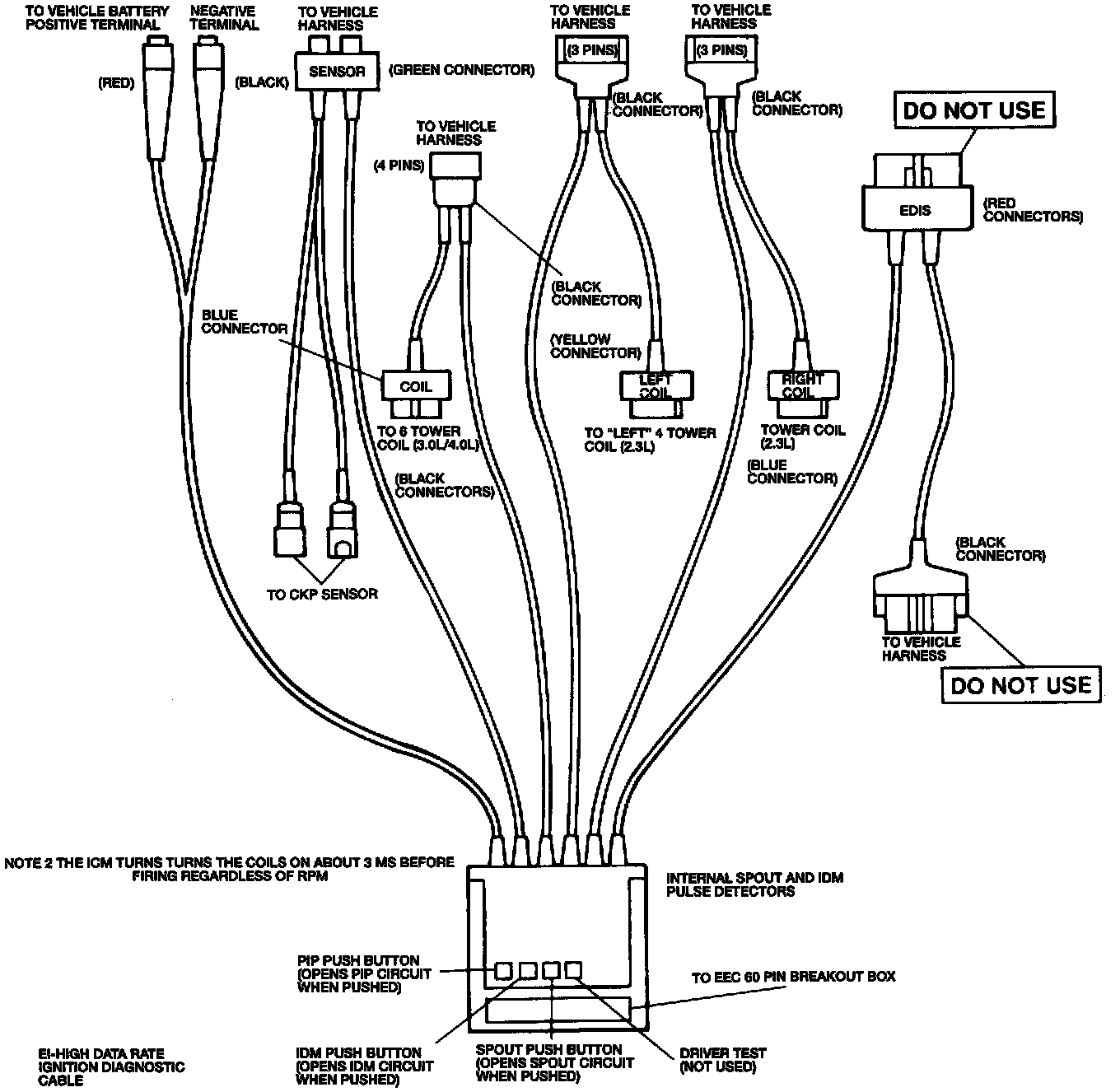 ^ The diagnostic cables may be connected with the breakout box in series with the ignition system components. The ignition system can be diagnosed by placing the correct overlay on the breakout box and monitoring the ignition system signals.
