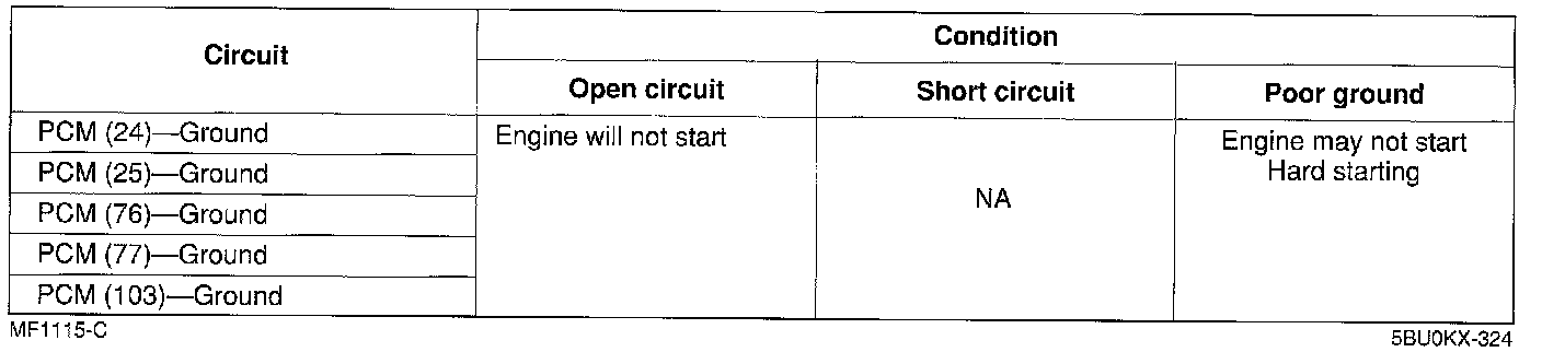 ^ If the circuit is open, the PCM memory function will not operate and Diagnostic Trouble Codes for intermittent malfunctions will not be indicated. Also, the learning control will be canceled. but will not produce any particular symptom.