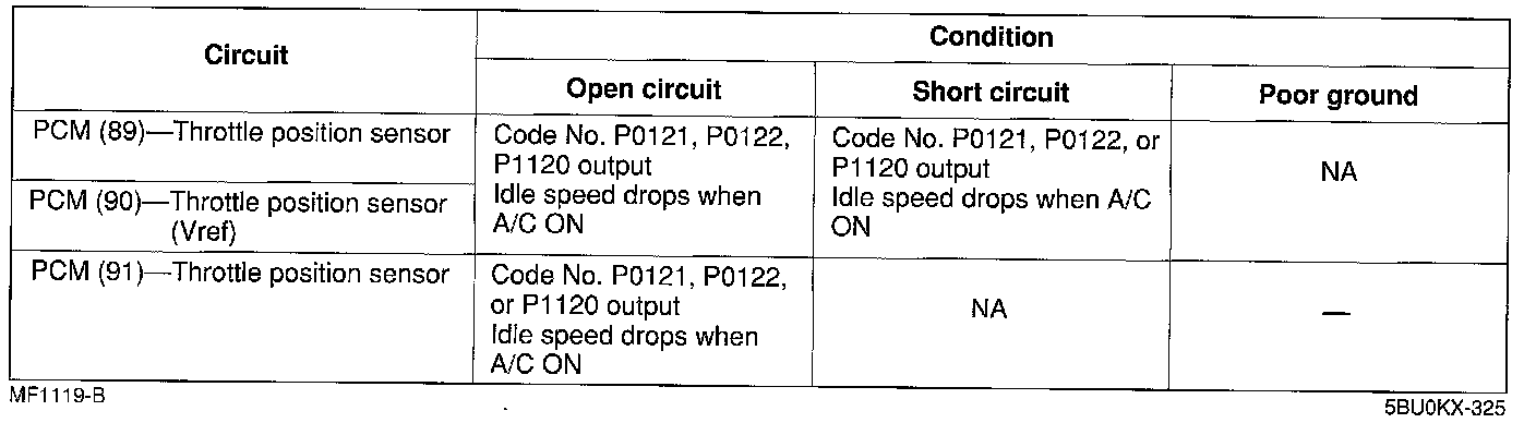 ^ If the throttle position sensor circuit fails, rough idle, poor acceleration or shift shock (AT) may occur.
