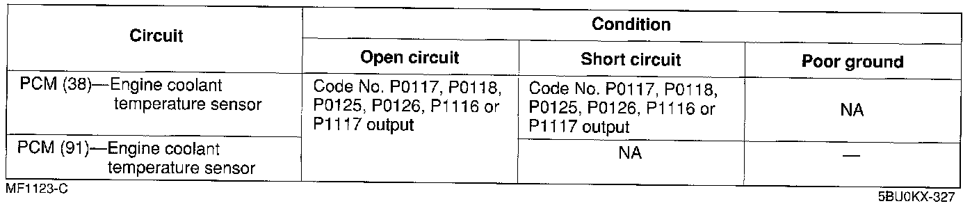^ If the engine coolant temperature sensor or circuit has an open or short, Diagnostic Trouble Code No. P0117, P0118, P0125, P0126, P1116, or P1117 is output.